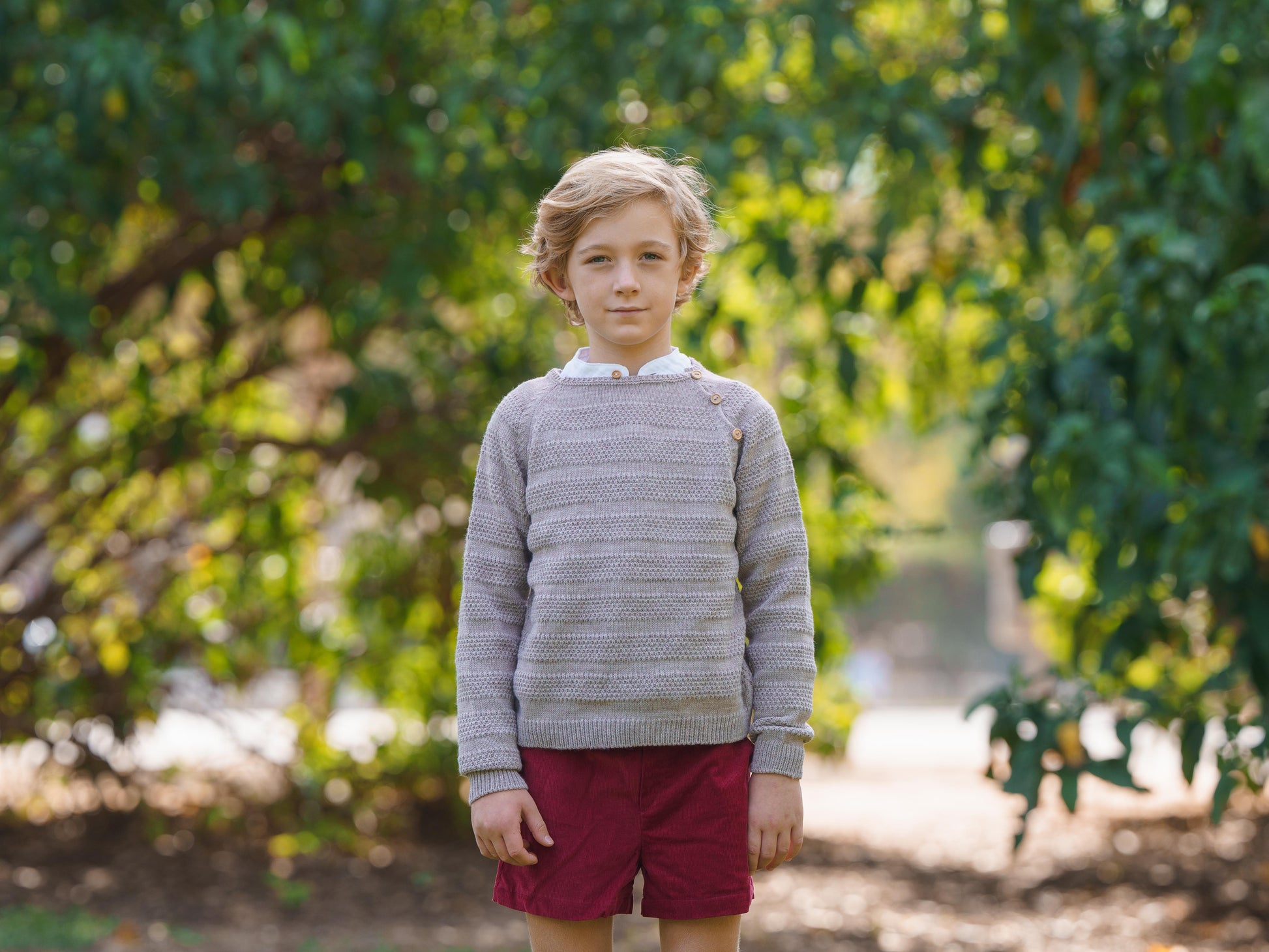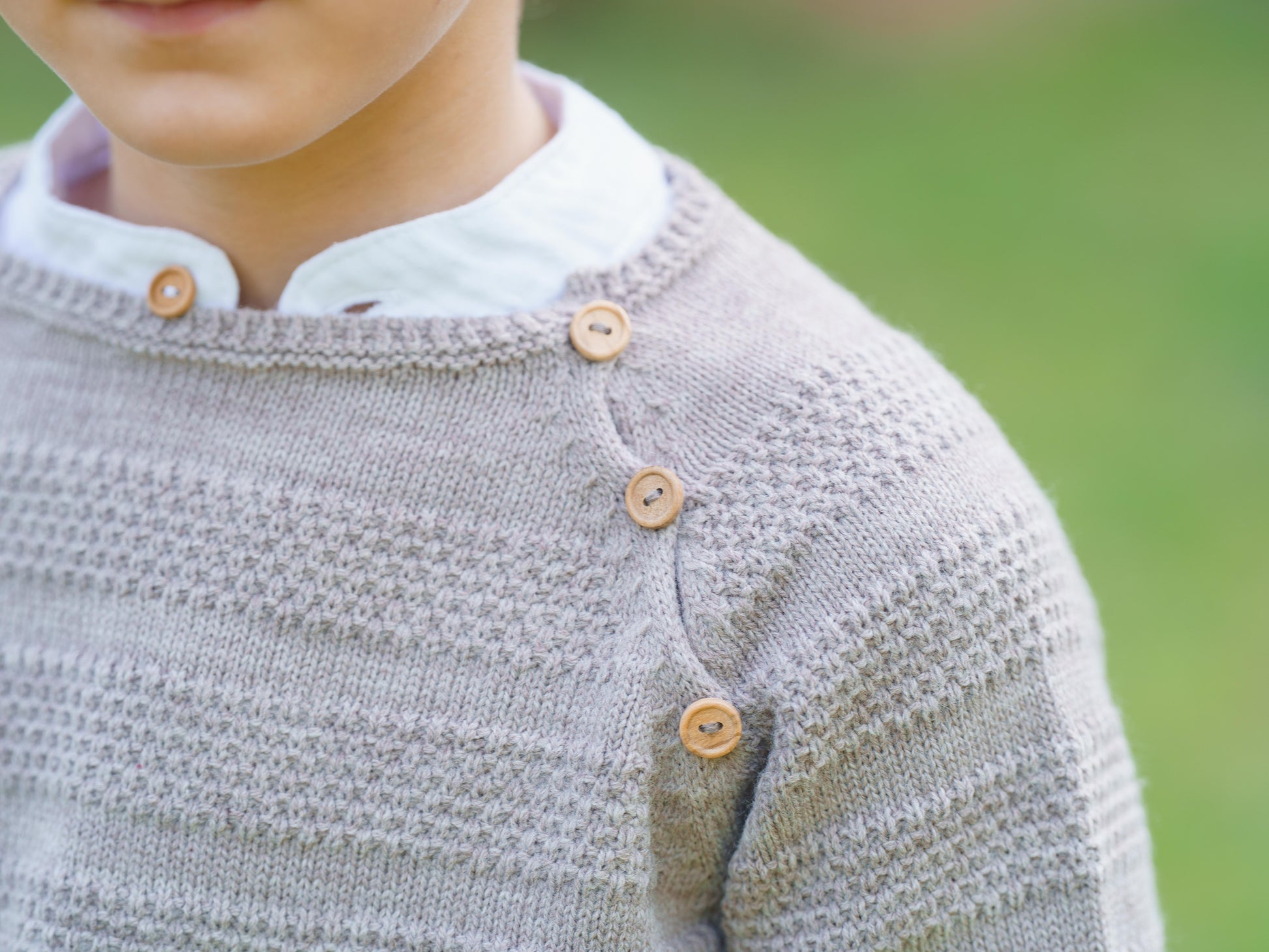 Presenta un bonito dibujo de punto combinado que aporta profundidad y elegancia, mientras que los botones de madera en el hombro facilitan su colocación y añaden ese toque artesanal tan característico de My Mini Leo. Su estilo atemporal lo convierte en una pieza versátil, ideal para combinar con camisas, petos o pantalones de pana de nuestra colección.