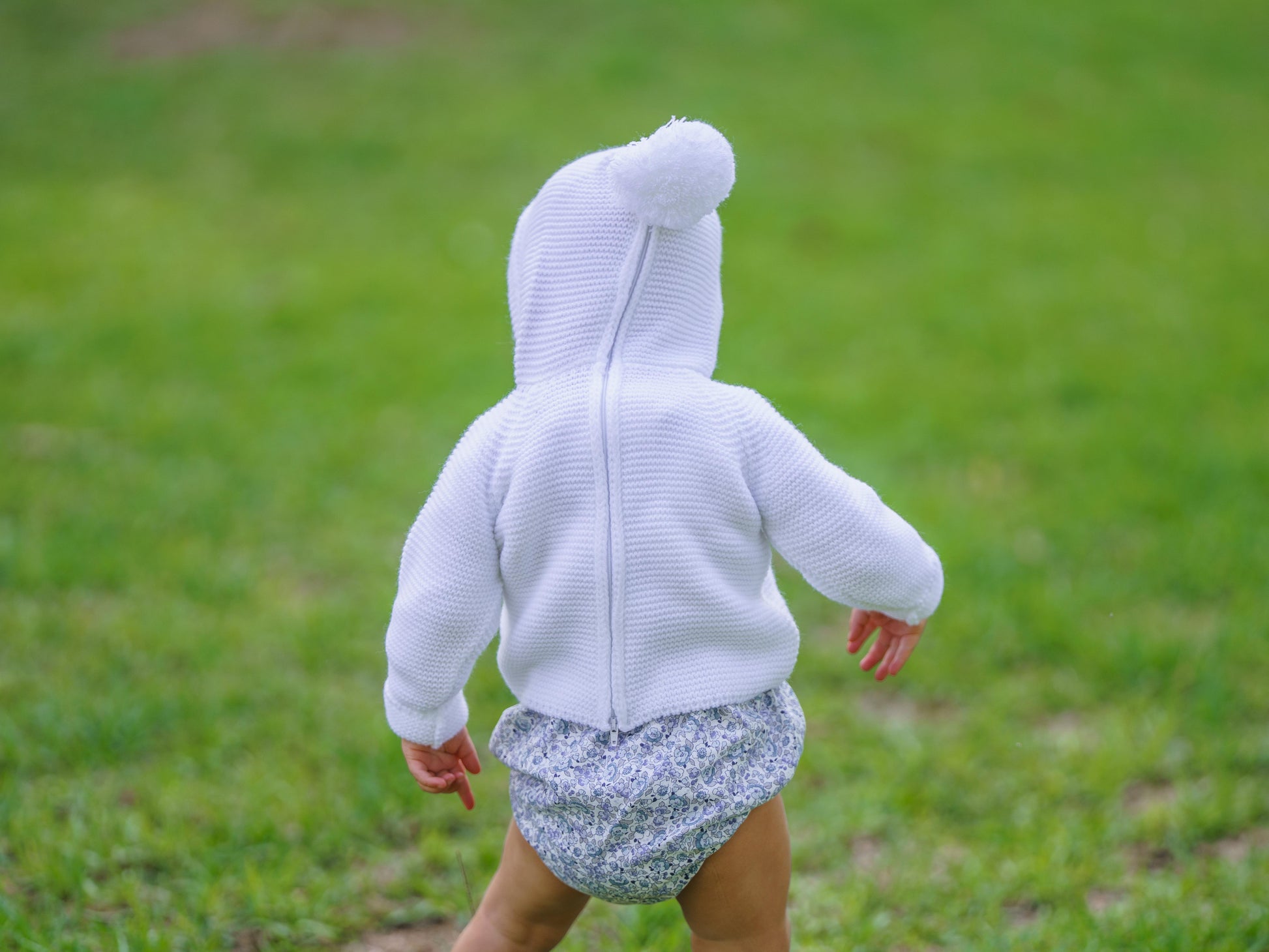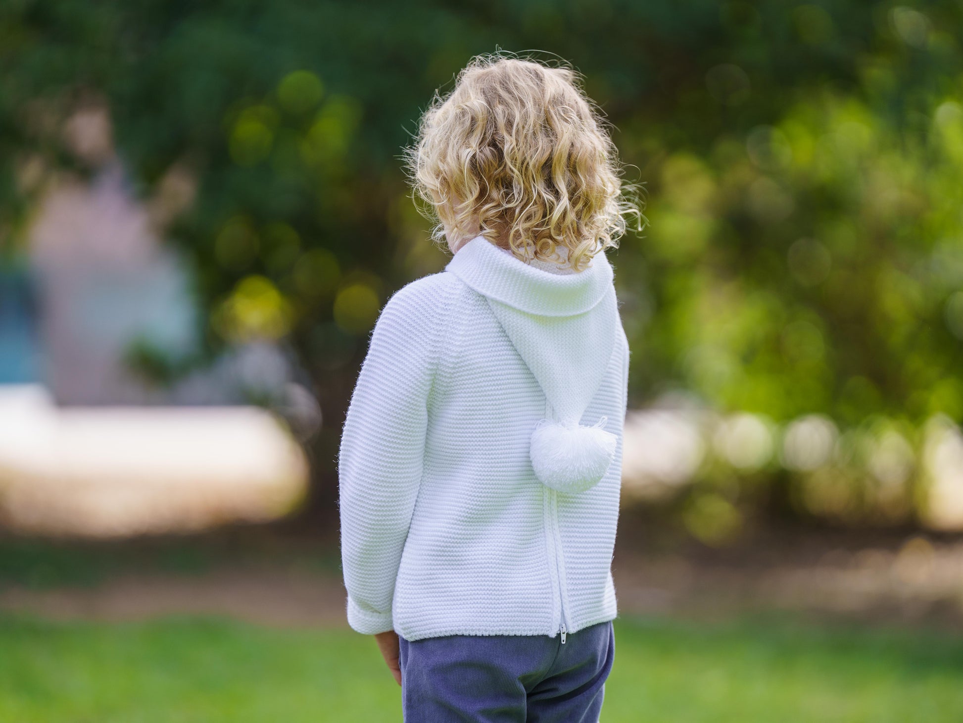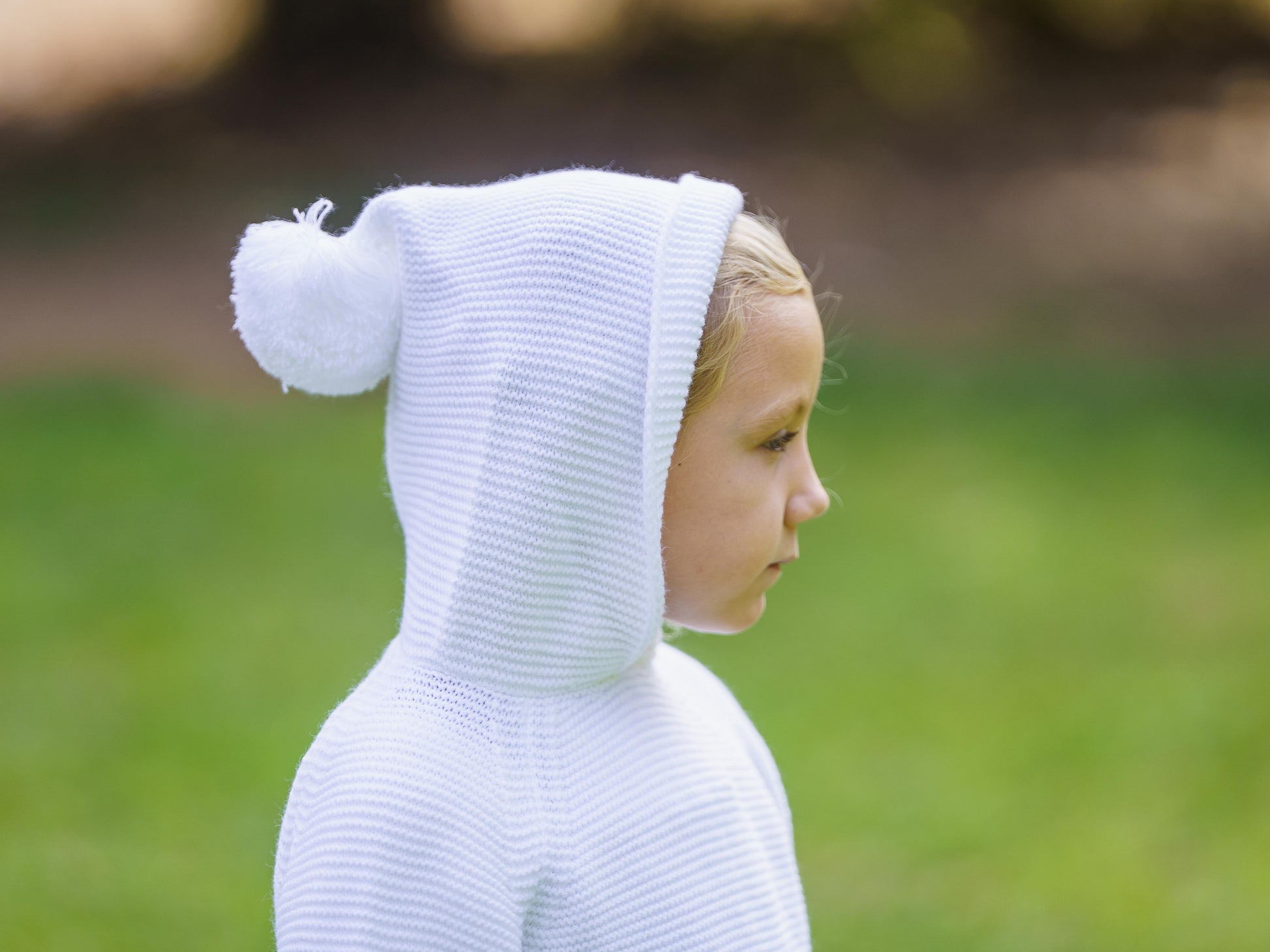 Su diseño incluye una capucha con pompón que añade un toque divertido y dulce, mientras que la cremallera trasera permite vestir al bebé con total comodidad. De color blanco puro, es una pieza versátil que combina fácilmente con cualquier conjunto, aportando luminosidad y un estilo atemporal.