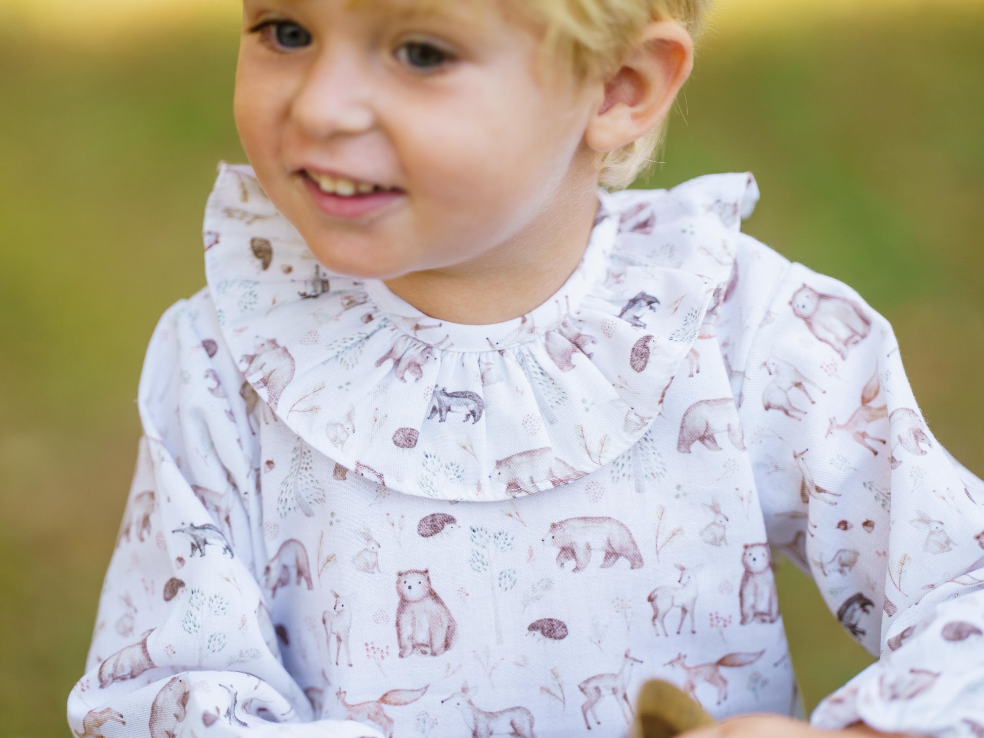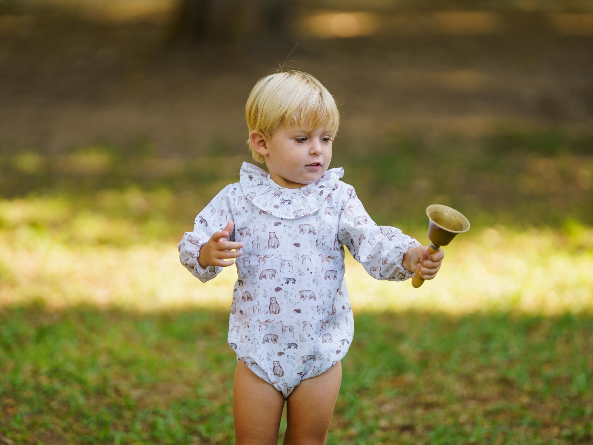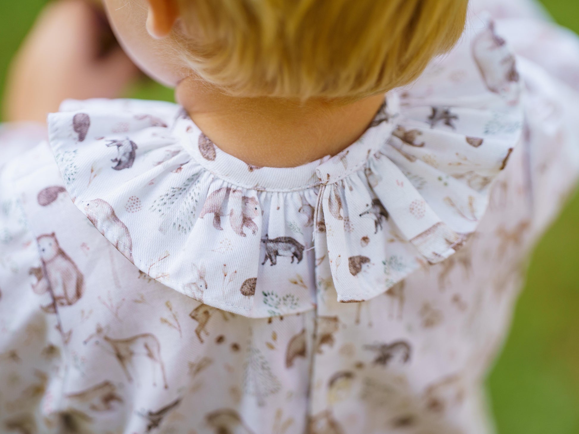 El Pelele Cabaña es una prenda cómoda y versátil, perfecta para los meses de otoño e invierno. Confeccionado en 100% algodón viyela, utiliza el tejido exclusivo de la subcolección Cabaña: un delicado estampado de osos, zorros, ciervos y pequeños detalles vegetales, que evocan la magia y la ternura de la vida en el bosque.
