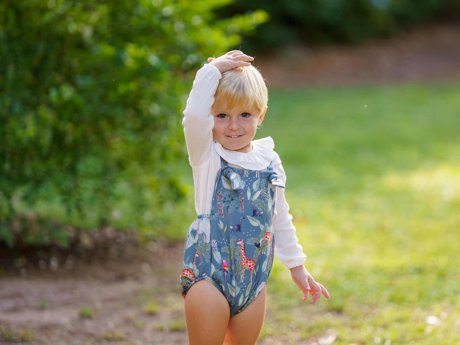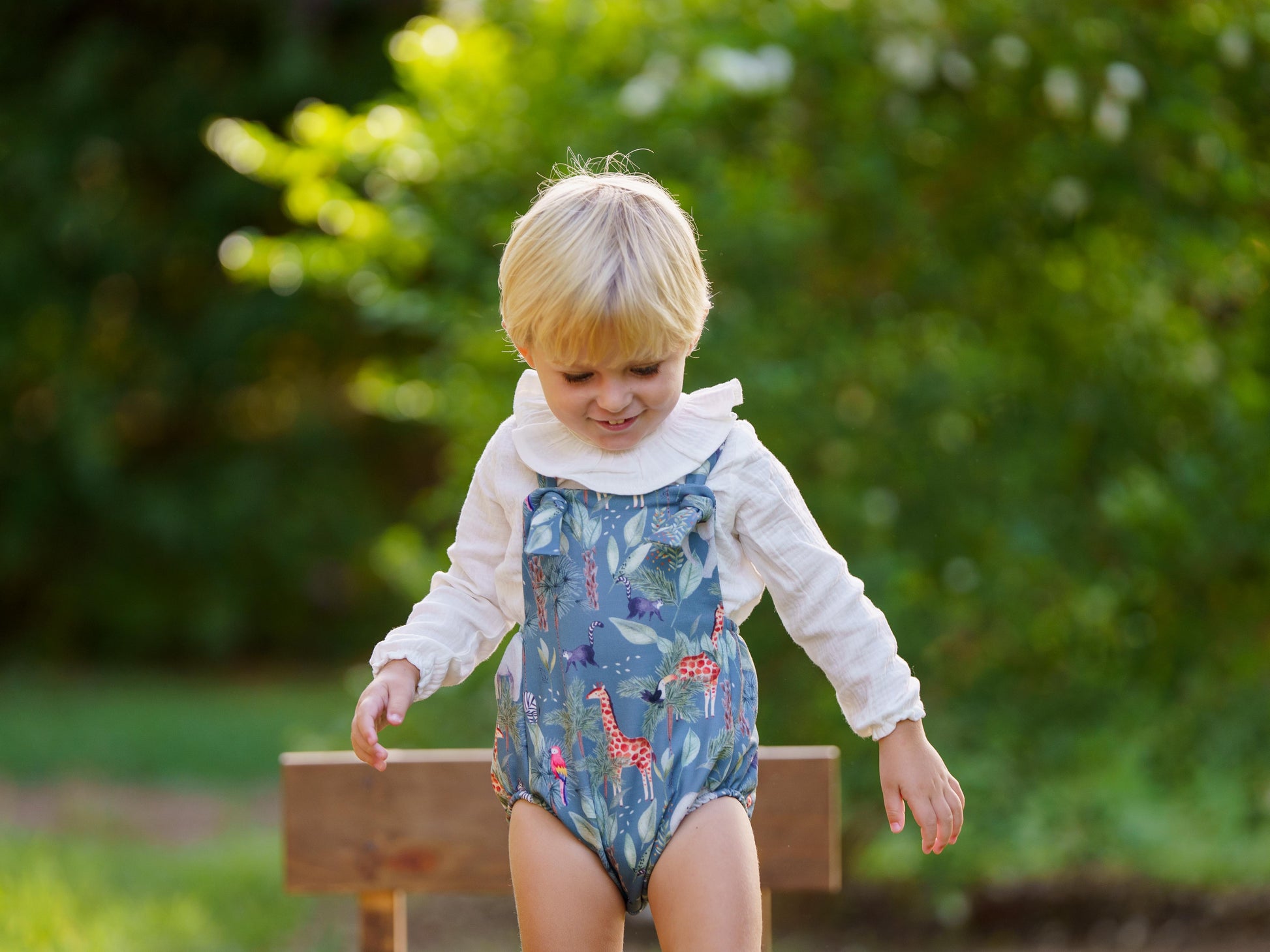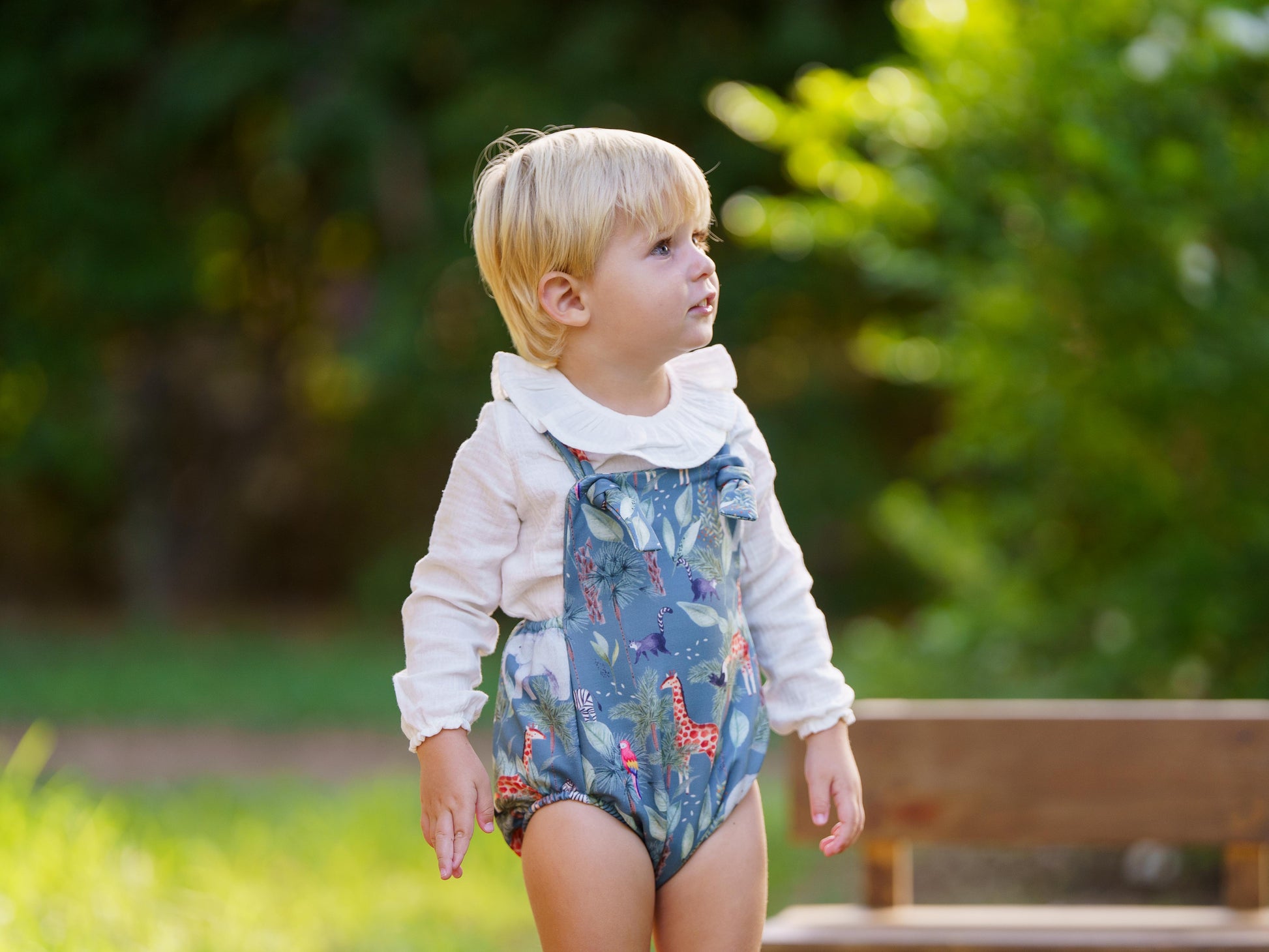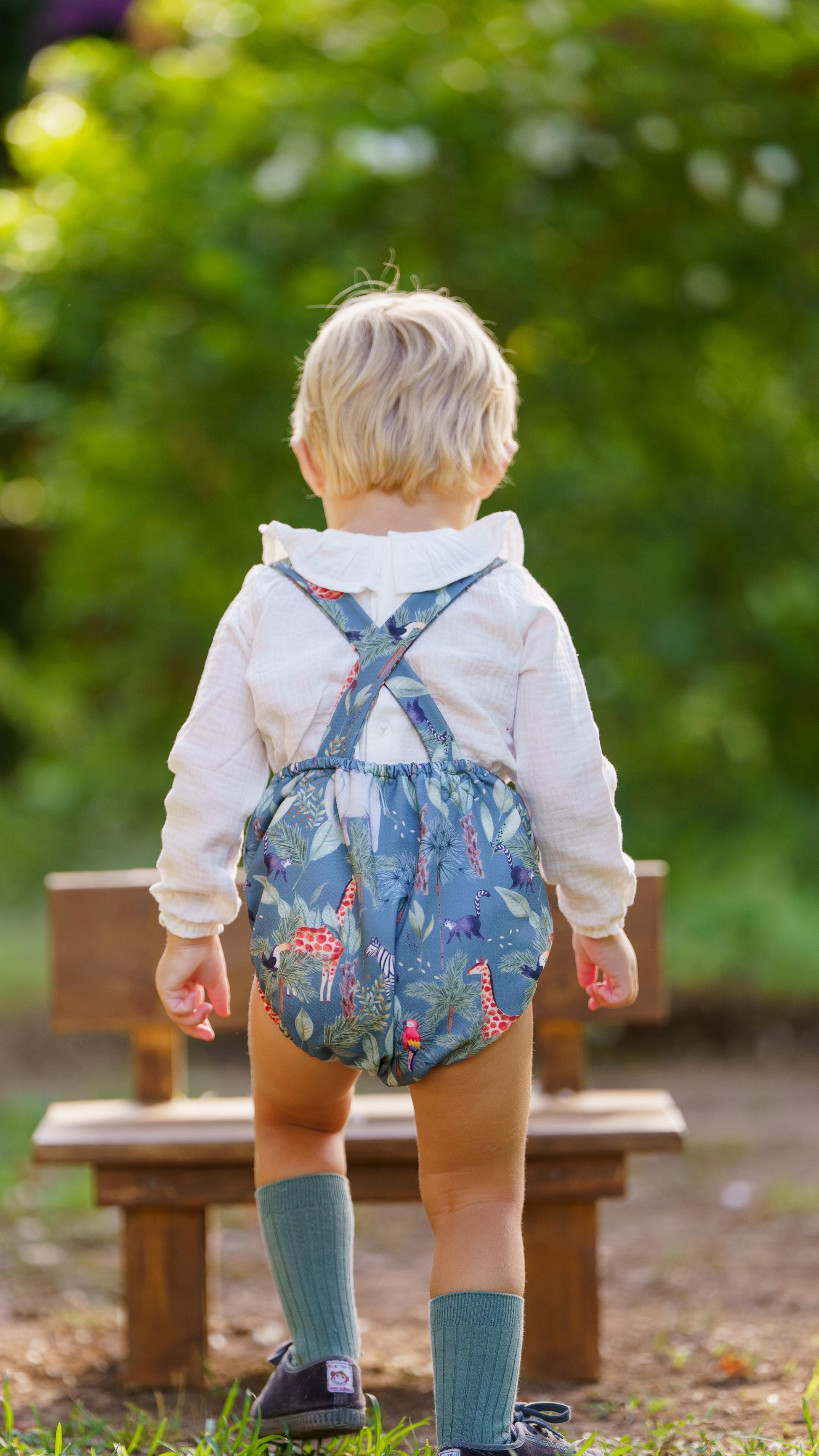 El Pelele Musgo es una prenda cómoda y encantadora, pensada para que los más pequeños disfruten del otoño e invierno con total libertad de movimiento. Confeccionado en nuestro tejido exclusivo de punto, cálido y suave, destaca por su original estampado selvático con elefantes, jirafas, cebras y aves tropicales sobre fondo verde musgo.