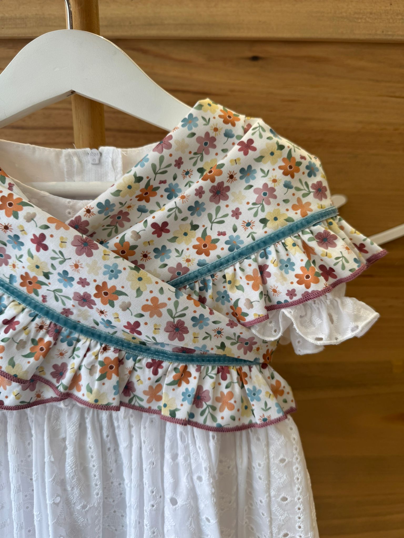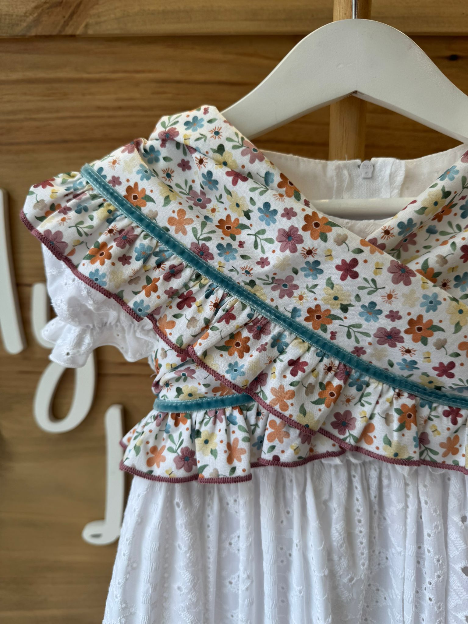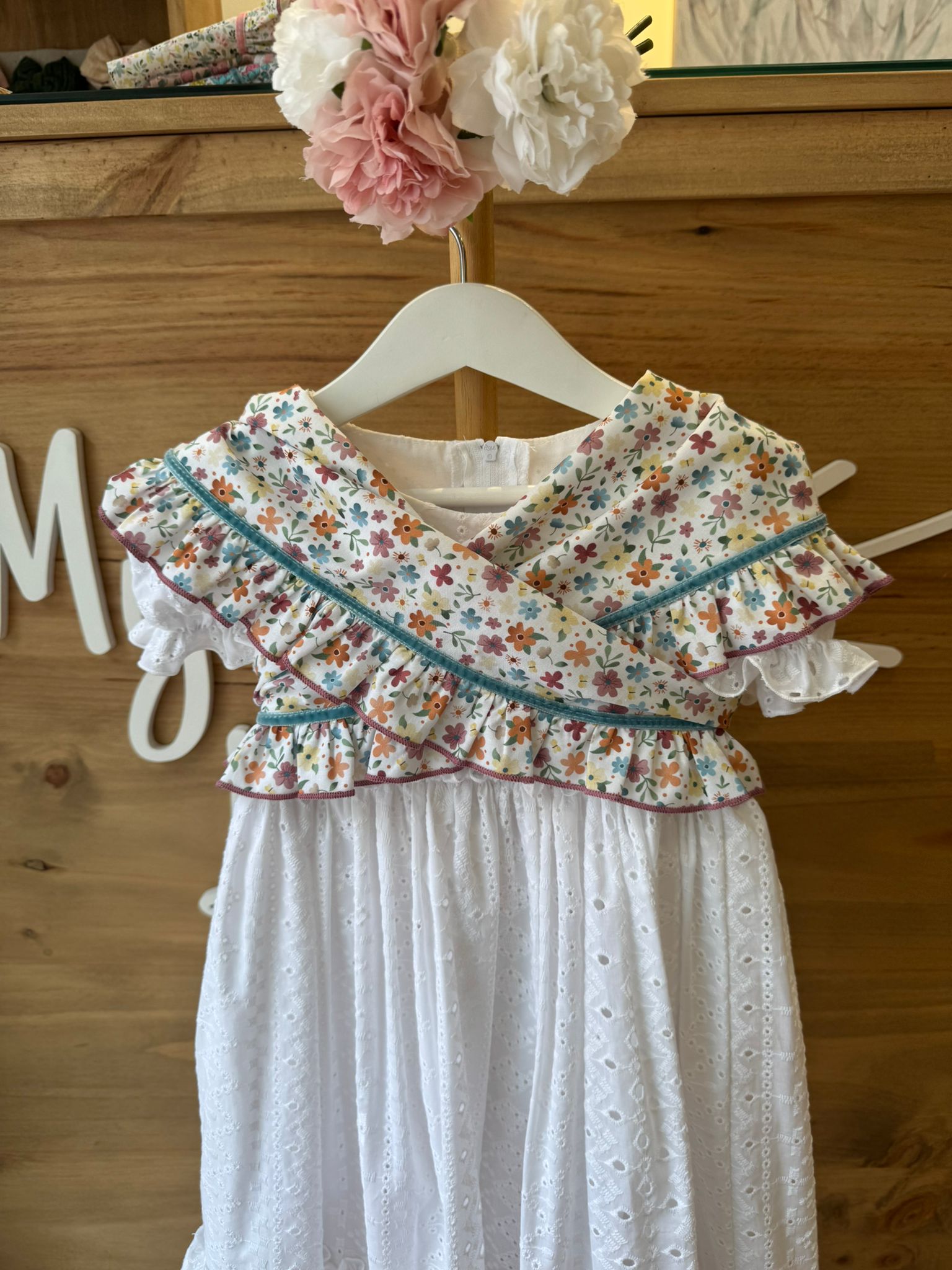 Su estampado floral multicolor, con pequeñas flores en tonos suaves pero vivos, crea un diseño fresco y luminoso, perfecto para ferias y romerías. Los volantes rematados y la cinta en tono verde agua aportan contraste y un toque flamenco muy especial, equilibrando alegría y elegancia infantil.