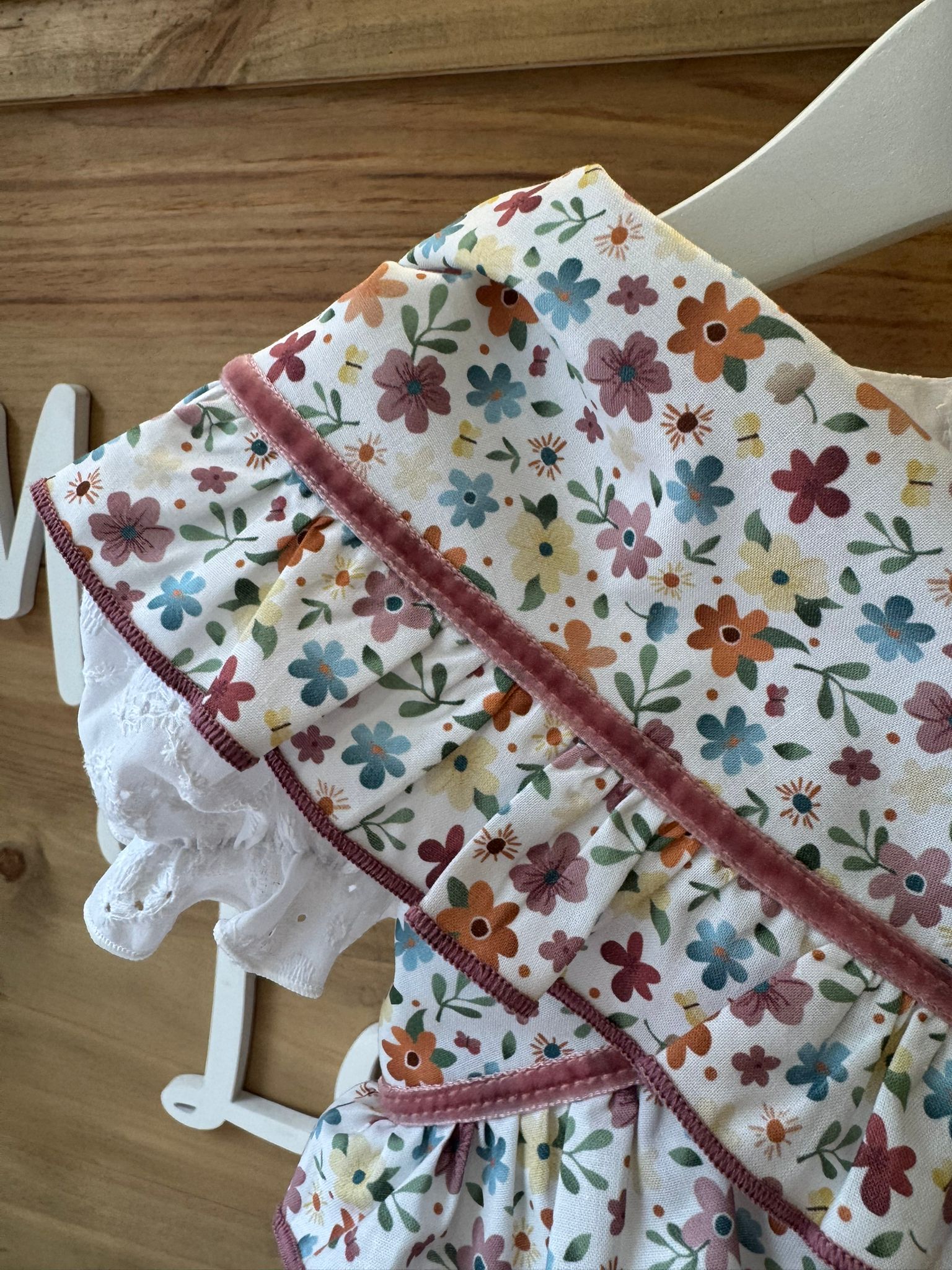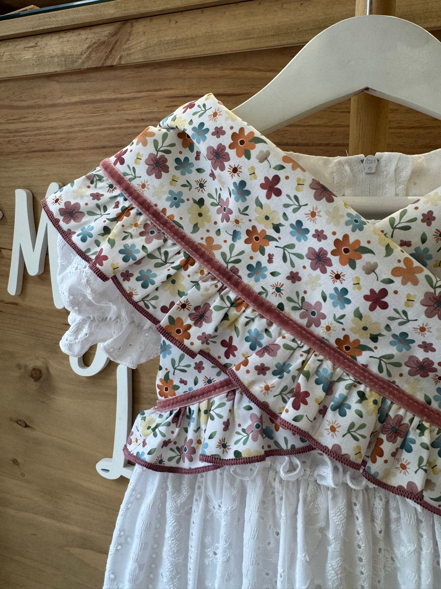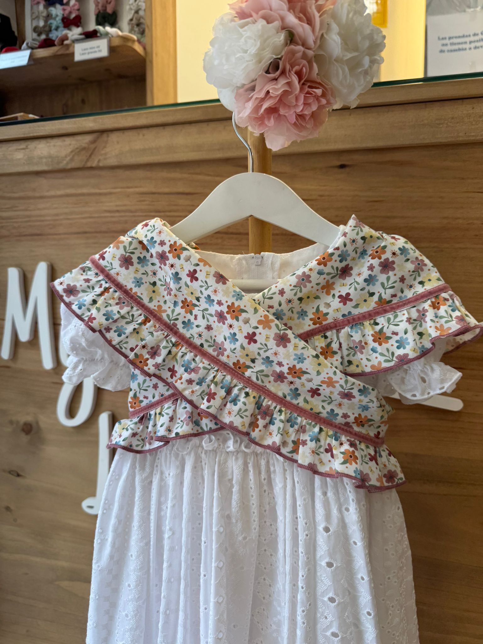 Su estampado floral multicolor, con pequeñas flores en tonos suaves pero vivos, crea un diseño fresco y luminoso, perfecto para ferias y romerías. Los volantes rematados y la cinta en tono rosa aportan contraste y un toque flamenco muy especial, equilibrando alegría y elegancia infantil.