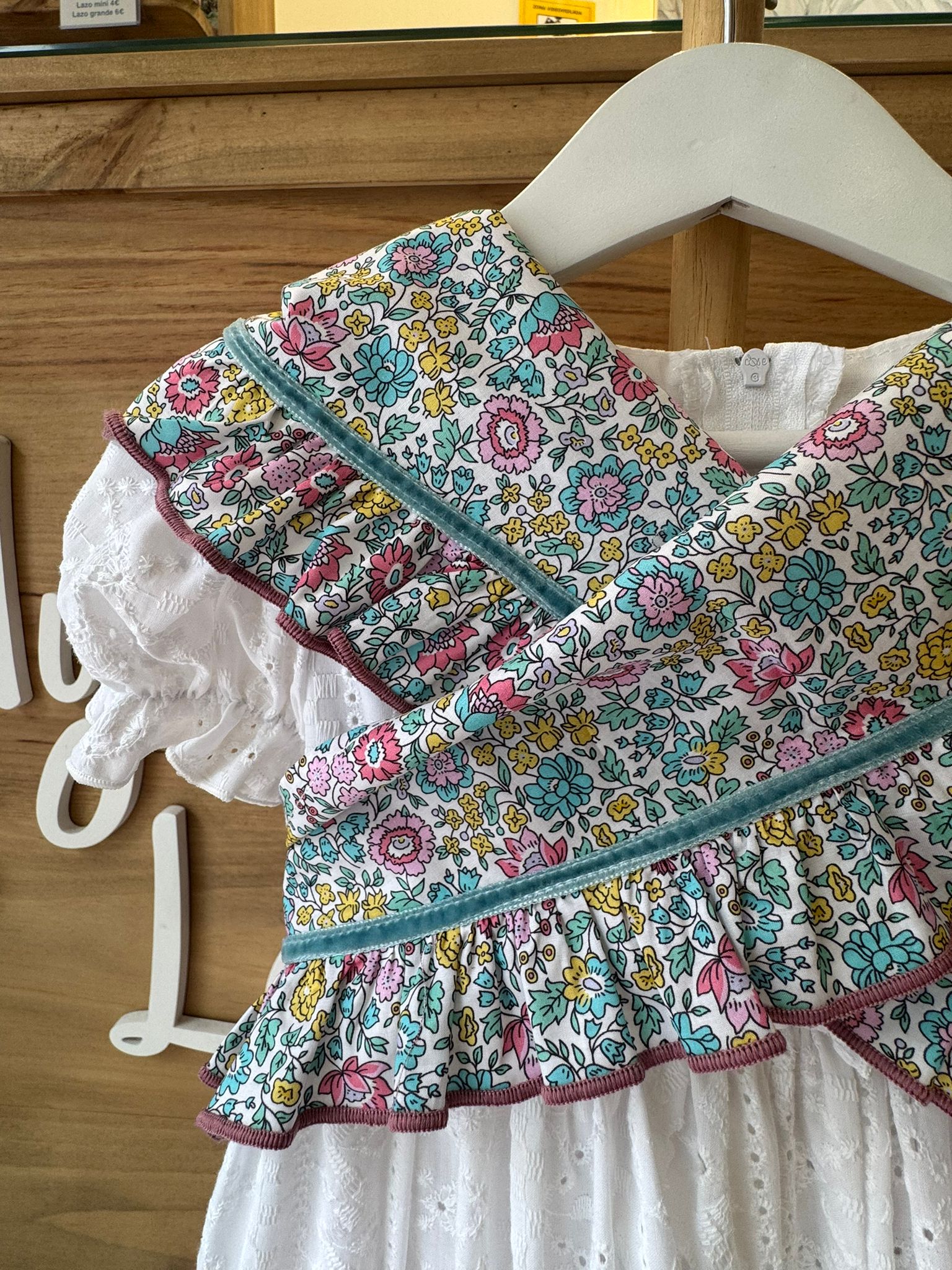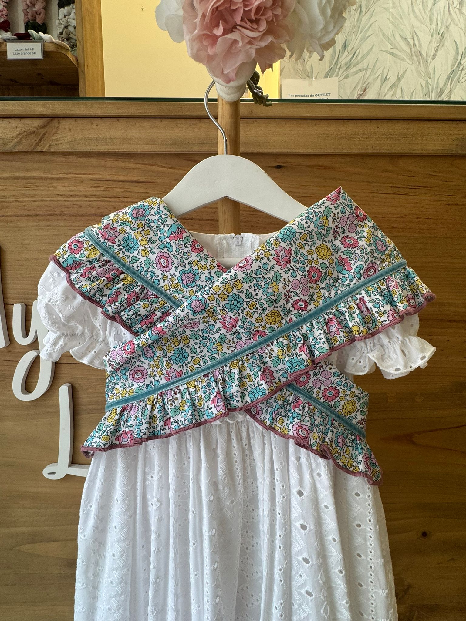 Su estampado floral multicolor sobre fondo claro, con flores en tonos rosa, turquesa, amarillo y verde, crea un conjunto luminoso y muy primaveral. La cinta de terciopelo en tono verde agua, integrada de forma sutil, aporta contraste y un toque flamenco elegante que realza el diseño sin recargarlo.