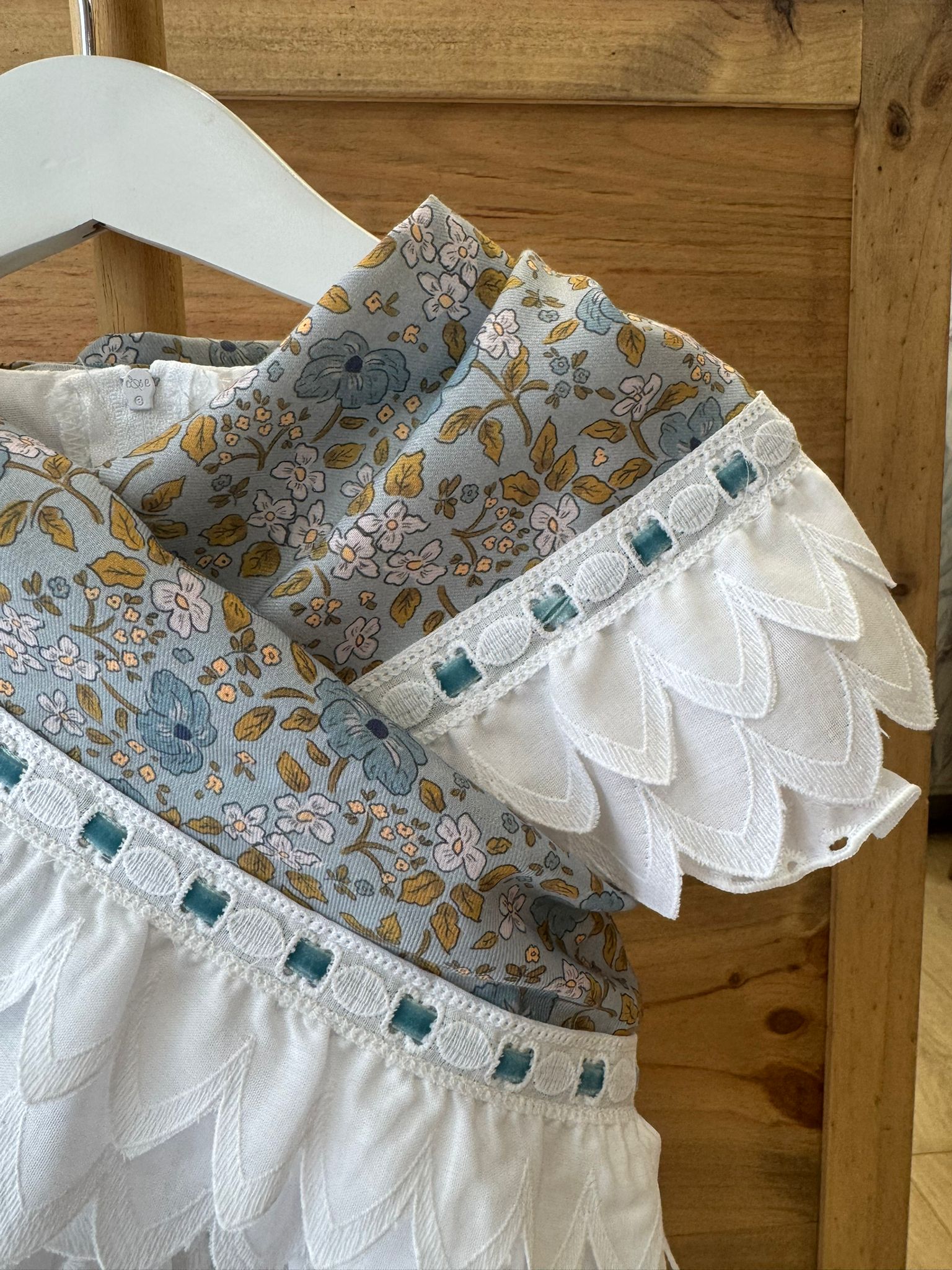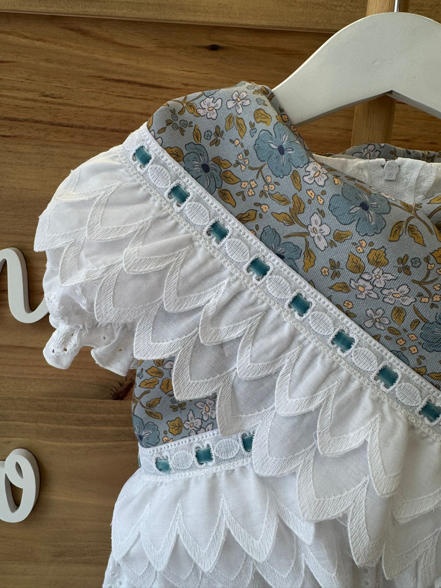 Su estampado floral, lleno de color y frescura, aporta alegría al conjunto, mientras que la tira bordada y la cinta de terciopelo como remate final añaden ese punto elegante y flamenco que marca la diferencia. Un equilibrio perfecto entre tradición y dulzura infantil.