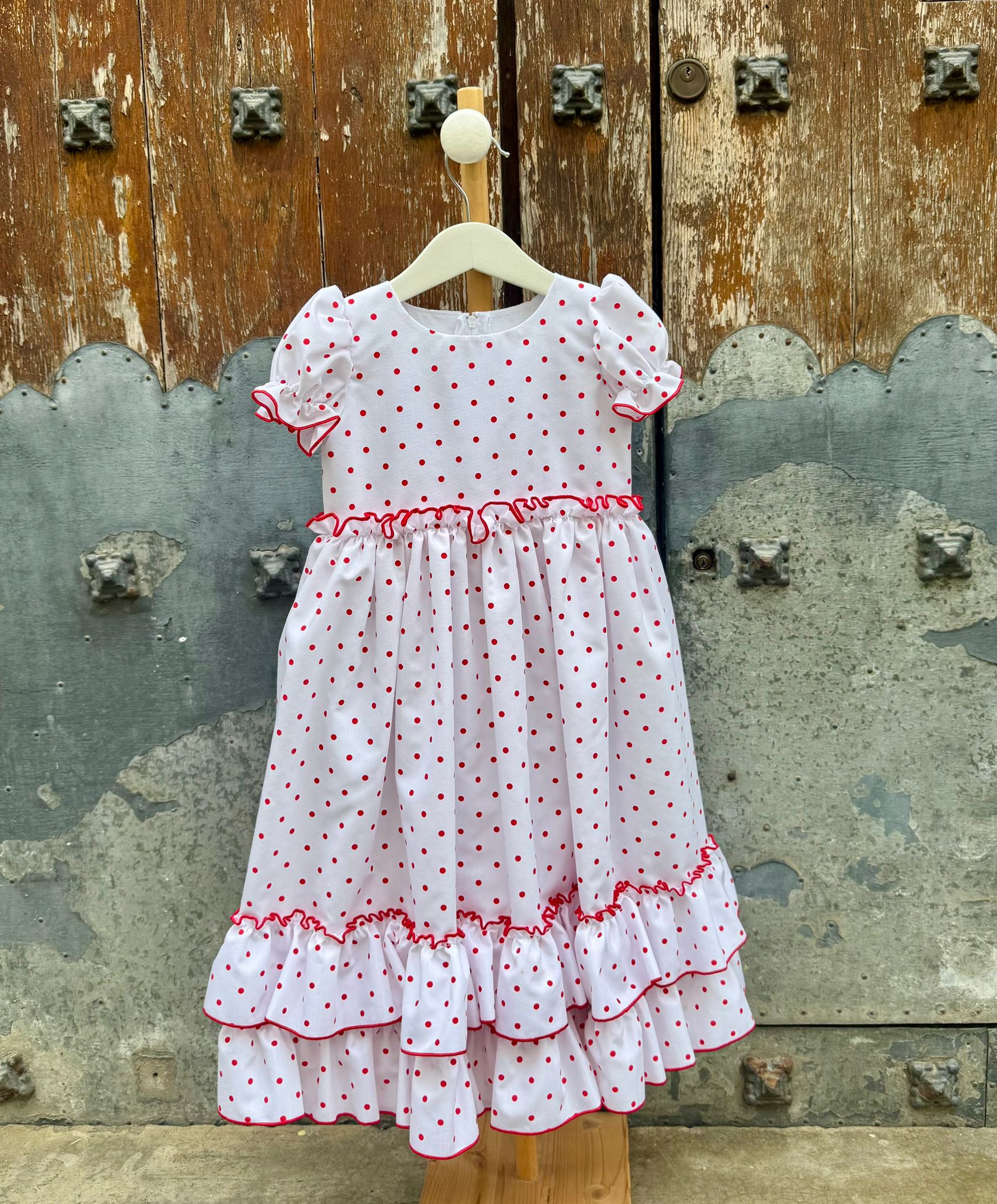 El cuerpo presenta un corte cómodo y favorecedor, adaptado a la silueta infantil, mientras que la falda canastera, con volantes amplios y bien definidos, aporta movimiento y gracia en cada paso. Las mangas abullonadas y los remates cuidados completan un diseño fiel a la estética flamenca más tradicional, pensado para el confort de las niñas.