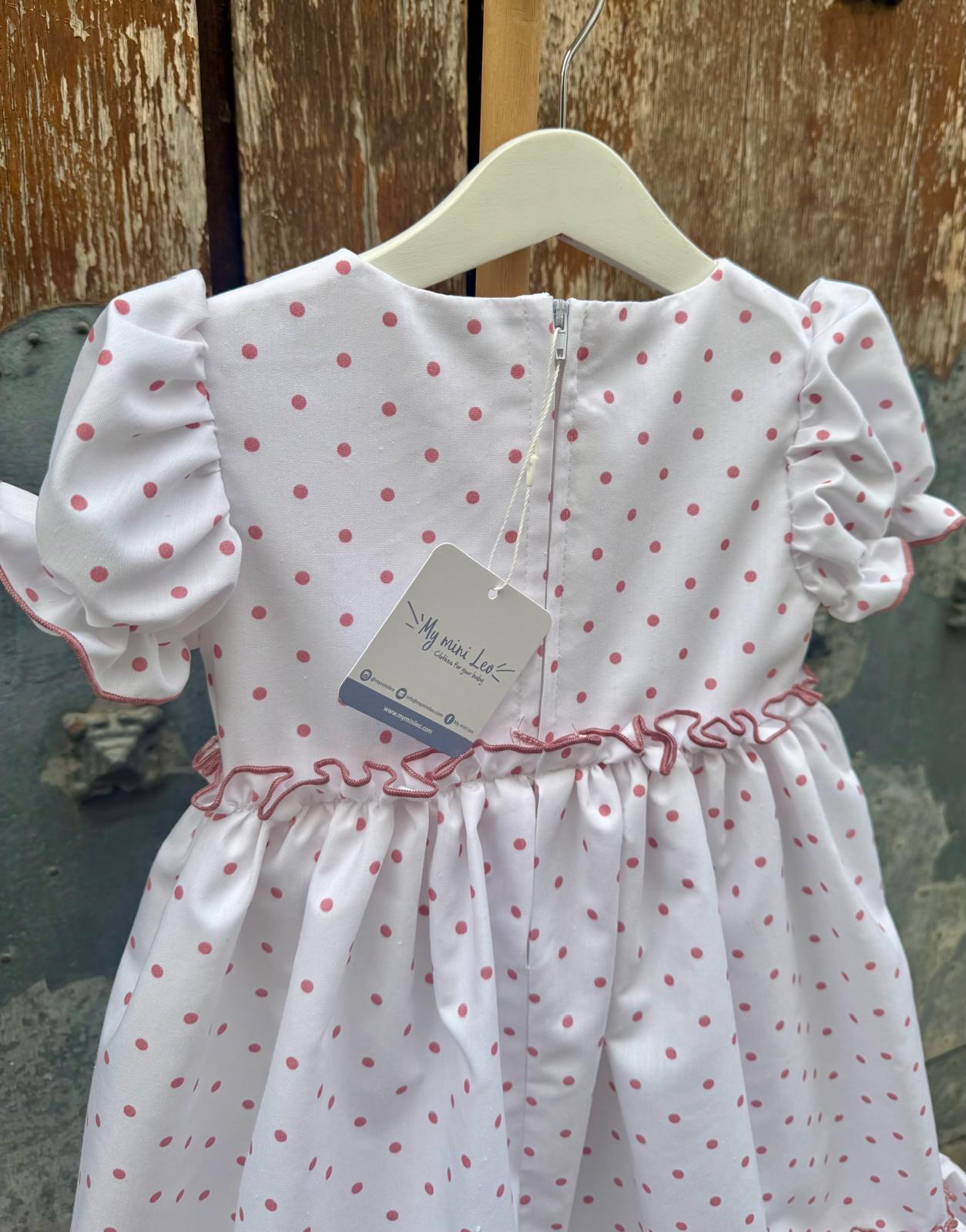 Su diseño tradicional combina el fondo blanco con la suavidad del lunar rosa, creando un conjunto dulce, elegante y lleno de encanto, perfecto para quienes buscan una flamenca infantil con un toque más tierno sin perder esencia andaluza.